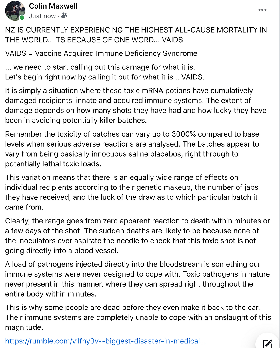 Gary... please take this comment down if it risks getting your site into danger of even more censorship... I entirely understand if you view it as too risque'. Today I had finally had enough as I heard more saturation ads on the radio adverting for Kiwis to rock up for the booster jabs as "our best defence against severe illness and death from Covid'. Knowing this to be complete and utter bollacks, I posted on Farsebook exactly what I thought about the outrageous lies we as taxpayers pay for to help facilitate even more tragic carnage.